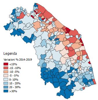 I risultati esposti nella Figura 1 illustrano l’effetto della convergenza irlandese sui singoli Comuni delle Marche sulla base dell’analisi descritta. Il quadro d’insieme che emerge mostra perdite concentrate nella collina litoranea delle province settentrionali, guadagni nelle aree interne di alta collina e montagna e nelle province di Fermo e soprattutto di Ascoli Piceno.