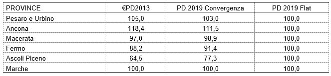Tabella 1 – Simulazione della distribuzione dei pagamenti per ettaro di SAU nelle province delle Marche a seguito della convergenza irlandese (indice: media regionale PD/SAU=100)