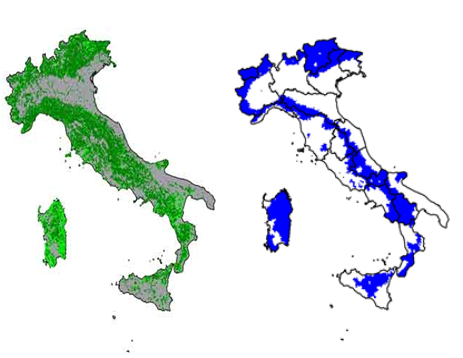 Figura 2 - Distribuzione della superficie forestale nazionale (immagine di sinistra) e distribuzione delle aree rurali con problemi complessivi di sviluppo (immagine di destra)