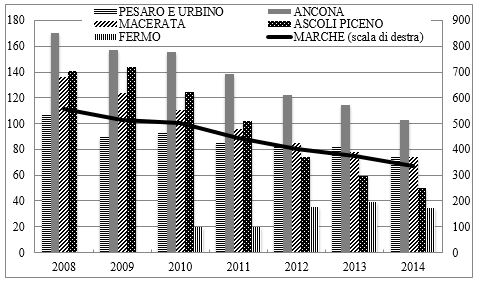 Le consistenze dei finanziamenti a medio-lungo termine al settore primario hanno subito un calo costante e molto significativo negli ultimi anni. Tra la fine del 2008 e la fine del 2014, lo stock dei finanziamenti regionali agli investimenti agricoli è sceso del 40%, passando da 555 a 337 milioni di euro (4). La flessione ha interessato di fatto tutte le province marchigiane, con livelli meno accentuati nella provincia di Fermo (Figura 1).