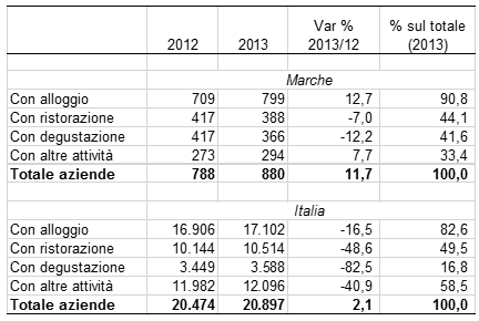 Secondo l’indagine Istat più recente, nel 2013 le aziende autorizzate all’esercizio agrituristico nelle Marche risultano 880, pari al 4,2% delle aziende agrituristiche italiane. Il numero di aziende, in progressiva crescita nel ultimo decennio, ha registrato un aumento del 12% rispetto al 2012, ben superiore al 2% a livello nazionale (Tabella 1).