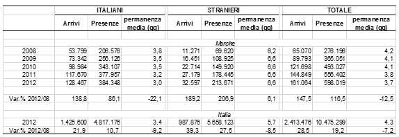 I dati sul movimento turistico negli esercizi agrituristici nelle Marche evidenziano un andamento in crescita, più marcato del totale degli esercizi ricettivi (Tabella 2). Nel 2012 i turisti presso gli agriturismi marchigiani si sono attestati sui 160.000 arrivi (+147% rispetto al 2008), pari al 22% degli arrivi complessivi degli esercizi extra-alberghieri. Il peso percentuale degli arrivi in agriturismi rispetto ad altre soluzioni ricettive è aumentato negli ultimi anni, in particolare da parte dei turisti stranieri che sembrano prediligere la vacanza rurale. Ciononostante gli stranieri nelle Marche rappresentano meno del 40% delle presenze complessive in agriturismo, contro il 54% a livello nazionale, e appena il 20% degli arrivi (41% a livello nazionale). La durata dei soggiorni dei turisti stranieri, che nel 2012 è stata di 6,6 giorni (in lieve aumento dal 2008), è mediamente superiore a quella degli italiani (3 giorni), peraltro in diminuzione. Quanto riscontrato a livello regionale riflette la situazione nazionale dove si rileva che i turisti italiani si trattengono più a lungo presso altre categorie di esercizi ricettivi.