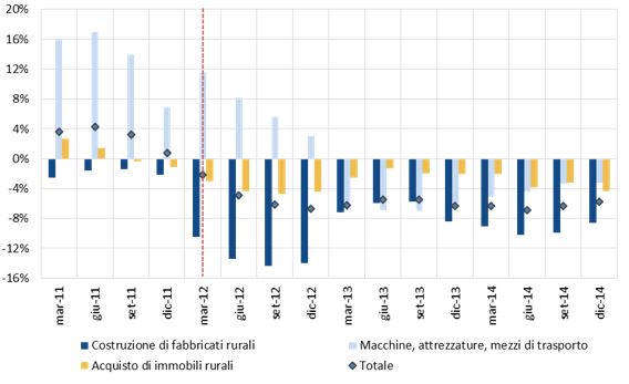 Figura 1 – Finanziamenti oltre il breve termine all’agricoltura, per destinazione di investimento (variazioni % delle consistenze sui 12 mesi)