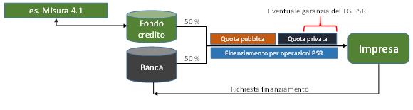 Per il finanziamento, l’impresa si rivolge direttamente alla banca, che provvede successivamente a richiedere la provvista pubblica al gestore del fondo (l’ammissibilità dell’operazione alla misura deve comunque essere verificata dalla Regione). La quota privata del finanziamento può essere coperta in parte dalla garanzia del fondo di garanzia PSR.