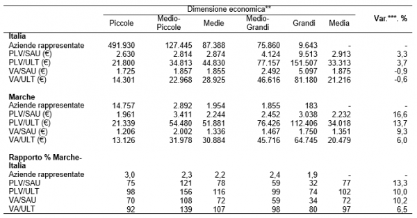 * PLV/SAU = Produttività agricola della terra; PLV/ULT = Produttività agricola del lavoro; VA/SAU = Produttività netta della terra; VA/ULT = Rendimento del lavoro aziendale